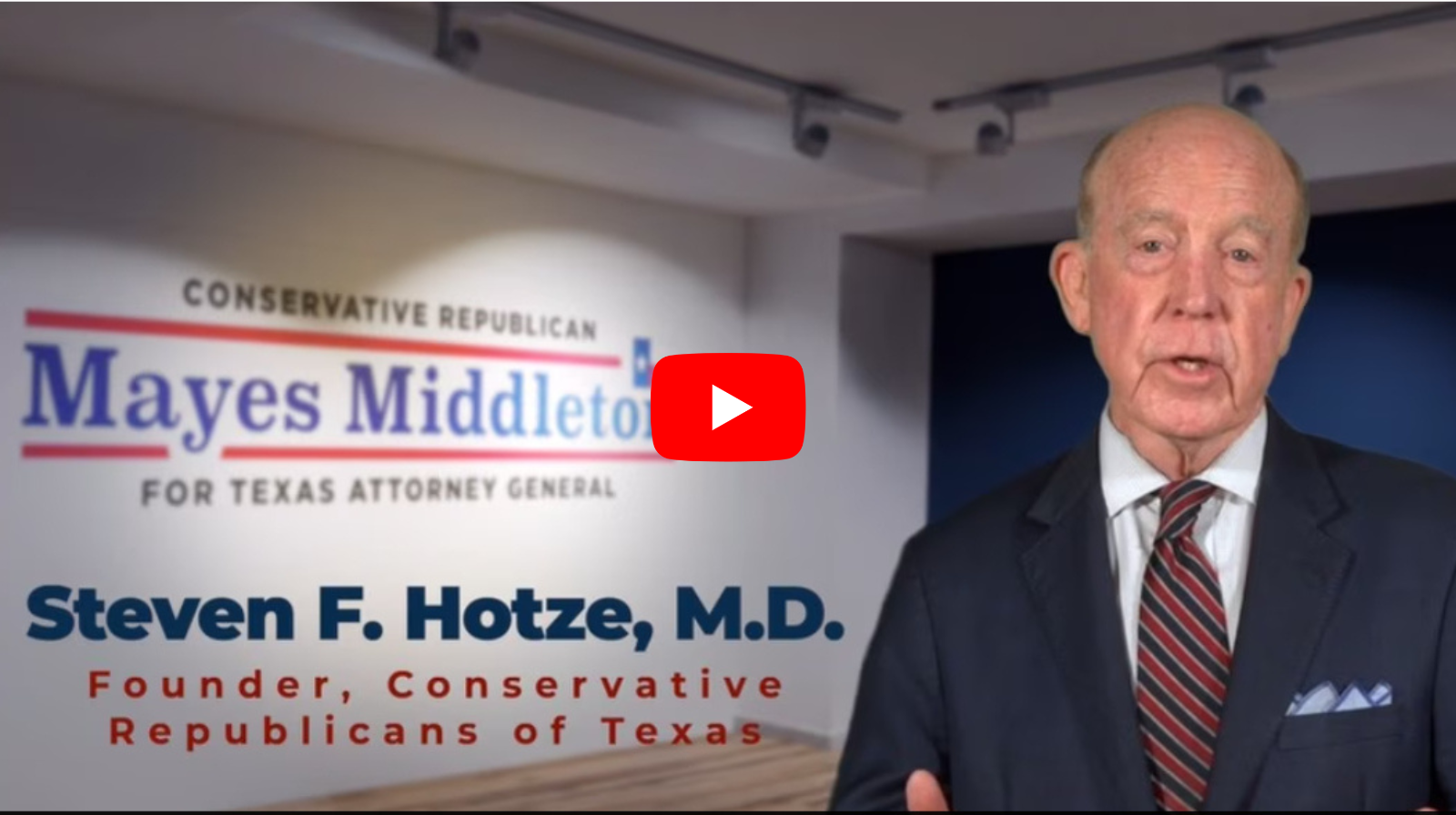 Hello, I’m Dr. Steve Hotze, Founder of Conservative Republicans of Texas, encouraging you to join me in supporting staunch conservative Senator Mayes Middleton for Texas Attorney General.